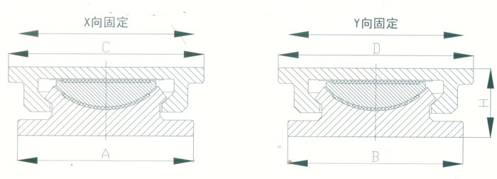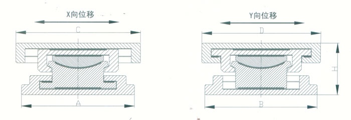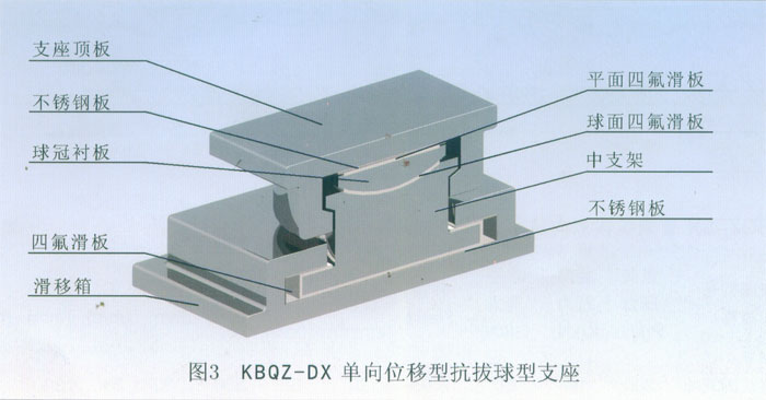 4 KBQZ系列抗拔球型支座 本系列支座主要分為抗拔球型支座和減震抗拔球型支座,下面對其進行分類介紹。4.1抗拔球型支座 此類支座分為固定型、單向位移型和雙向位移型,支座結構如圖3。其主要由支座頂板、不銹鋼板、平面聚四氟乙烯滑板、球冠襯板、球面聚四氟乙烯滑板、中支架、聚四氟乙烯滑板、不銹鋼板和滑移箱組成。支座中的相對滑移部件之間,采用目前世界上摩擦系數最低的聚四氟乙烯滑板和不銹鋼板相隔,充分減小了摩擦阻力,使各部分之間的運動流暢,避免爬行現象的產生。本類支座通過球面聚四氟乙烯滑板上部構件沿著球面相對于下部構件的轉動實現轉角(常用值為0.02rad),在工作過程中支座沿著滑移箱滑道滑動實現水平位移。 豎向壓力的傳遞是通過支座頂板,不銹鋼板,平面聚四氟乙烯滑板,球冠襯板,球面聚四氟乙烯滑板,中支架,聚四氟乙烯滑板,不銹鋼板依次疊加傳至滑移箱底板。 豎向拔力的傳遞是通過支座頂板和中支架的抗拔接觸面將作用于支座頂板上的上.拔力傳至中支架,再由中支架與滑移箱之間的抗拔四氟滑板和不銹鋼板將力傳至滑移箱頂板。 水平力的傳遞是通過支座頂板側壁與中支架側壁之間.的接觸面將水平力傳至中支架,再由中支架與滑移箱的接觸面傳至滑移箱側壁根部。 固定型抗拔球型支座不設滑移箱。4.1.1普通抗拔雙向位移型球型支座KBQZ-SX普通抗拔雙向位移型球型支座參數表 表74.1.2普通抗拔單向位移型球型支座KBQZ-DX普通抗拔單向位移型球型支座參數表 表84.1.3普通抗拔固定型球型支座KBQZ-GD普通抗拔固定型球型支座選用參數表 表9