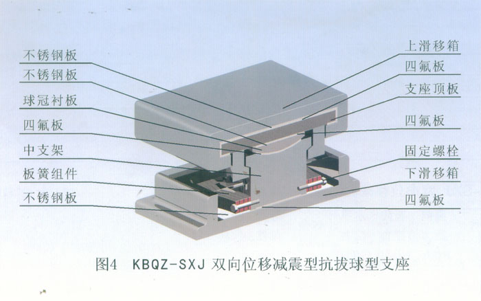 豎向壓力的傳遞是通過上滑移箱,不銹鋼板,聚四氟乙烯滑板,支座頂板,不銹鋼板,平面聚四氟乙烯滑板,球冠襯板,球面聚四氟乙烯滑板,中支架,聚四氟乙烯滑板,不銹鋼板依次疊加傳至下滑移箱。